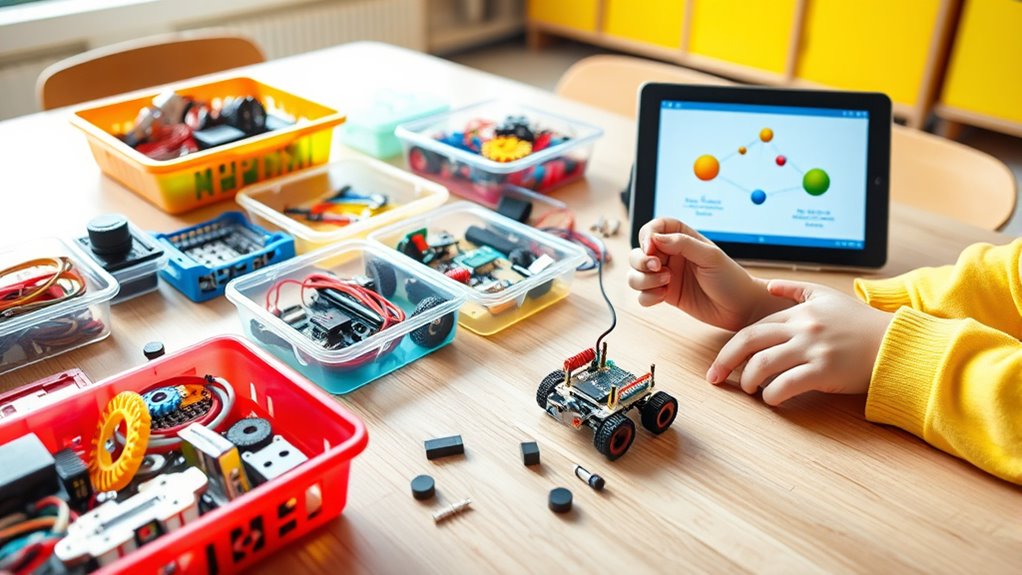 When selecting an educational STEM kit, ease of assembly plays a essential role in keeping kids engaged and confident. I look for kits with clear, step-by-step instructions suited to my child’s reading level, enabling independent building. Components that snap together easily without extra tools help minimize frustration and keep the process fun. It’s also important that the parts are appropriately sized and not overly complex for my child’s age and fine motor skills, ensuring smooth assembly. Organized storage or trays for parts make the process more manageable and prevent losing small pieces. Additionally, visual guides or video tutorials are valuable tools that help my child understand the steps and build confidence throughout the project. These features make learning both accessible and enjoyable.