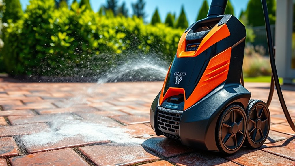 Choosing the right electric pressure washer depends heavily on understanding its power and pressure capabilities. Higher PSI (pounds per square inch) generally implies more cleaning power, which is ideal for tougher jobs like driveways or siding. A flow rate of at least 1.8 GPM (gallons per minute) guarantees effective removal of dirt and grime. Many models offer adjustable pressure settings, so you can customize the power based on the surface, preventing damage. The combination of PSI and GPM determines overall cleaning efficiency; higher values mean faster, more thorough results. For most residential tasks, a washer with 2000-3000 PSI and 1.5-2.5 GPM hits the sweet spot for power and efficiency. Understanding these factors helps you pick a model that’s both effective and safe for your cleaning needs.