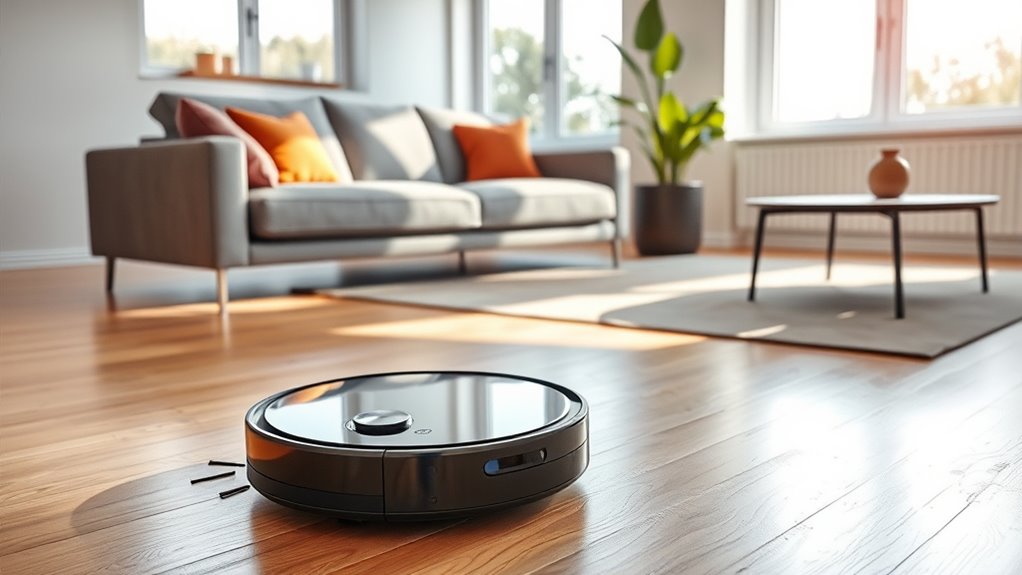 Surface compatibility sets the foundation for effective cleaning, but to truly maximize a Eufy robot vacuum’s performance, understanding its navigation technology is key. Many Eufy models use laser-guided (LIDAR) systems or infrared sensors to create detailed maps of your home. This allows the vacuum to plan efficient routes, avoid obstacles, and cover every spot systematically. Some models even feature AI-powered obstacle detection, recognizing objects like wires or furniture to prevent collisions and entrapment. The right navigation tech makes a huge difference in complex layouts, tight spaces, or multi-floor setups. It minimizes missed areas, prevents the vacuum from getting stuck, and ensures your floors are cleaned thoroughly without constant supervision. Good navigation technology is essential for a smart, reliable cleaning experience.
