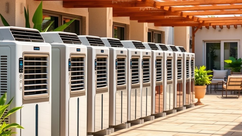 Evaporative coolers are generally more energy-efficient than traditional air conditioners. I’ve noticed they use markedly less electricity because they rely on water evaporation rather than refrigerants and compressors. This makes them a great eco-friendly choice and lowers your energy bills. While they work best in dry climates, I find they’re perfect for keeping cool without the heavy energy load. If you’re looking to save on power, these coolers are a smart option.