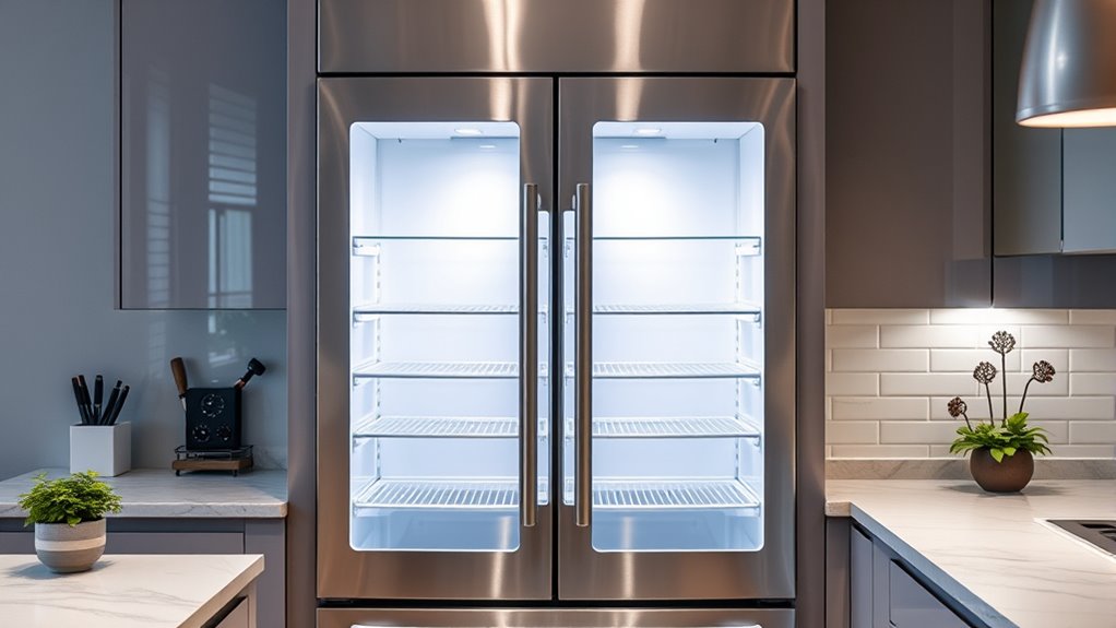 Did you know that choosing the right features can extend a French door fridge’s lifespan by up to 20%? I’ve found that reinforced door hinges, high-quality seals, and durable shelving greatly boost durability. Additionally, stainless steel exteriors resist scratches and corrosion. I always look for models with solid construction and reliable compressors, because these elements ensure my fridge stays functional and stylish for years to come.