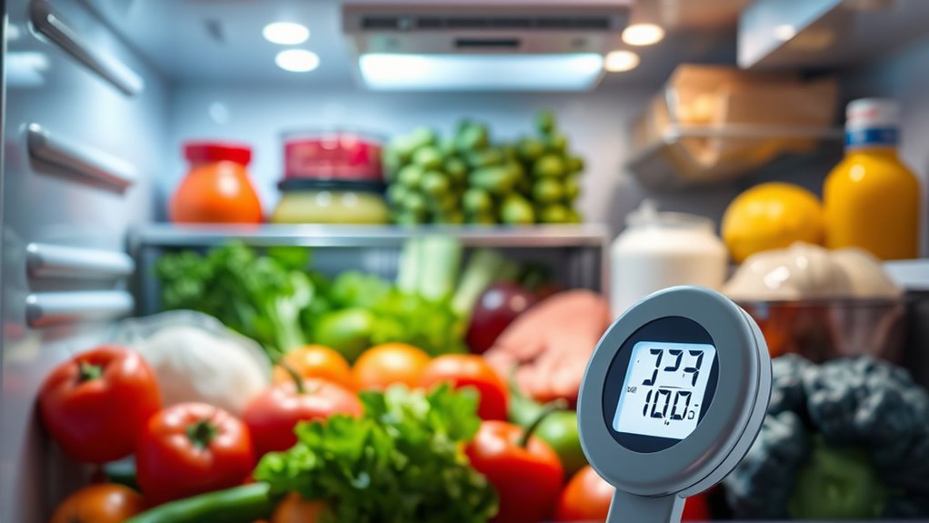 Hold onto your petticoats—yes, there are specific thermometers for different types of food storage. I recommend using a detailed fridge thermometer for perishables like meat and dairy, and a separate one for produce to monitor ethylene gas effects. This helps maintain ideal freshness and safety. Choosing the right thermometer ensures your food stays at the perfect temperature, preventing spoilage and keeping your kitchen efficient.