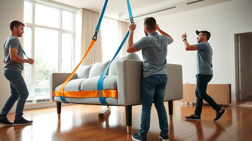 Want to stay safe when using furniture moving straps? I always double-check the straps for tears or fraying before lifting. I secure the load tightly, making sure weight is balanced, then lift slowly and steadily. I never rush or ignore my footing. Remember, if something feels off or unstable, I stop and reassess — safety’s worth the extra moment. Trust me, a cautious approach keeps injuries at bay.
