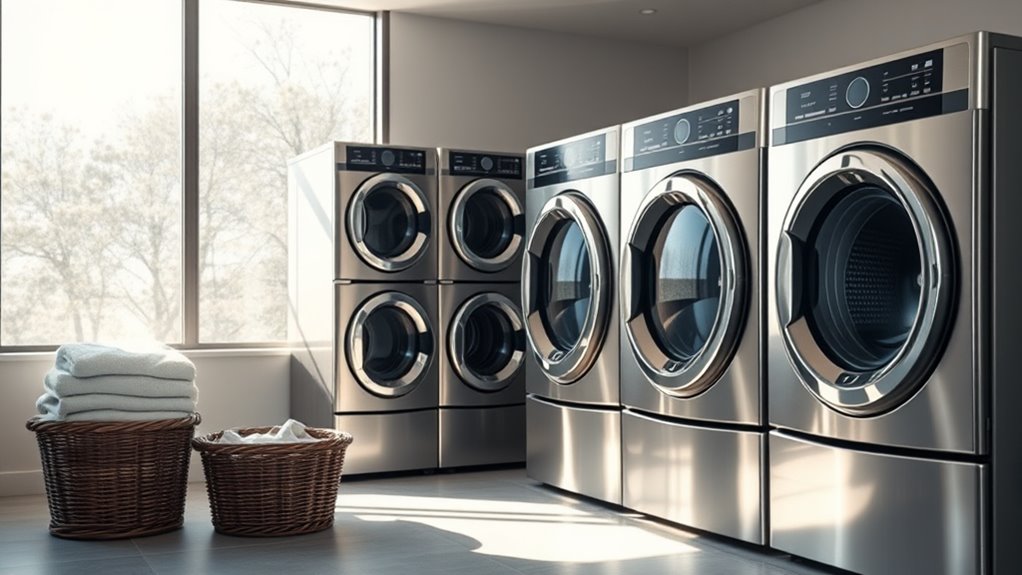 Choosing a durable gas dryer means paying close attention to the quality of its materials and construction. I look for models built with high-quality, corrosion-resistant materials like stainless steel or tough metals, ensuring longevity. Checking the thickness and integrity of the outer drum and internal parts helps me avoid early wear and tear. Reinforced doors and hinges are also essential, as they withstand frequent opening without loosening or damage. I verify the build quality of fundamental components such as the gas valve, flame sensor, and igniter, since these are critical for reliable performance. Ultimately, I prefer models with a sturdy frame and stable base, which minimize vibrations and movement during operation, thereby extending the dryer’s lifespan.