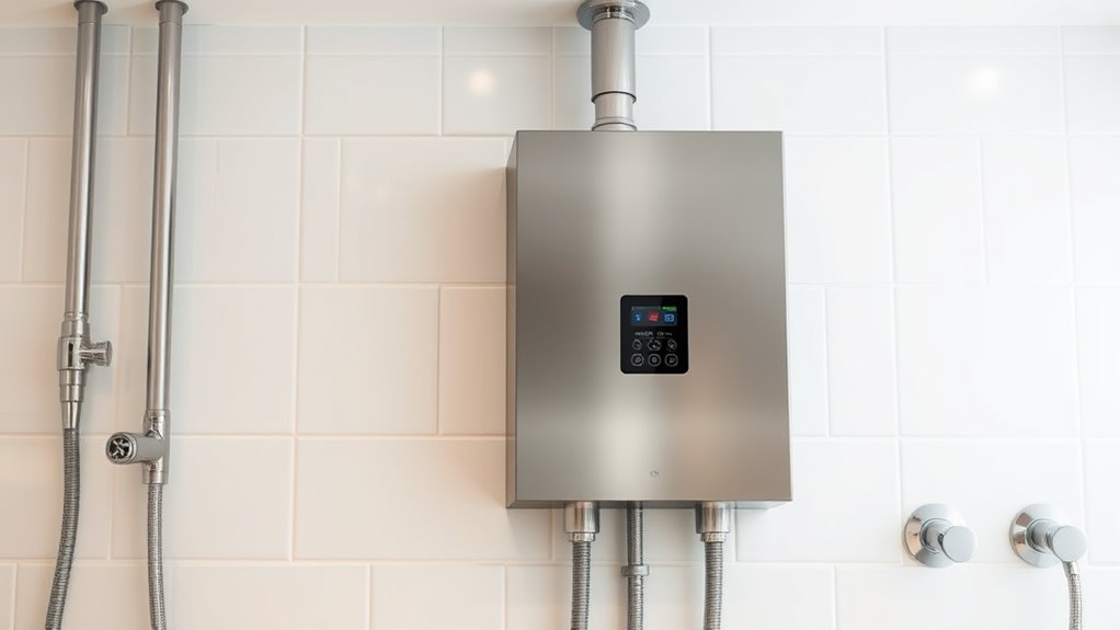 Ensuring your gas tankless water heater fits properly in your available space is key to a smooth installation and safe operation. I recommend measuring the area carefully to confirm the unit’s dimensions and weight will be supported by the walls or mounting surfaces. Adequate clearance around the heater is essential for maintenance and servicing, so plan for enough space to access components easily. If you’re installing an outdoor or vented model, check that the area has proper airflow and ventilation to prevent issues. Additionally, consider how easily you can connect water, gas, and electrical supplies without excessive piping or wiring. Proper planning guarantees the unit operates efficiently, safely, and with minimal hassle, making your investment worthwhile.