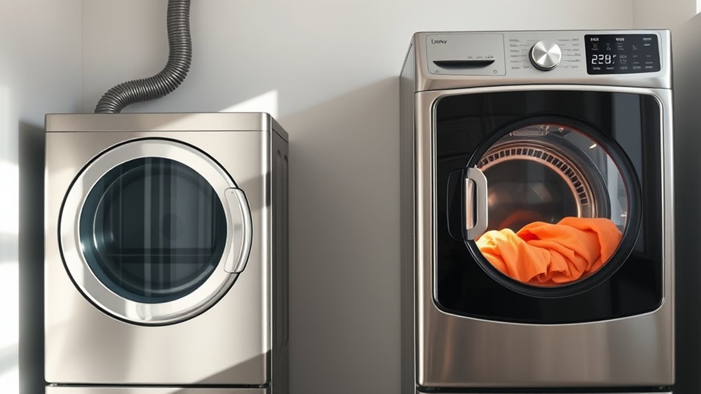 Have you ever wondered why gas dryers often finish drying clothes faster than electric ones? The main reason is that gas dryers generate heat more quickly and efficiently, thanks to their high-temperature burners. This rapid heat production speeds up moisture evaporation, reducing drying time. Electric dryers, on the other hand, rely on heated coils that warm up more gradually, which can extend drying cycles. However, other factors like the dryer’s capacity and sensor technology also influence drying speed. These sensors can detect moisture levels and automatically adjust cycle times for ideal drying, regardless of power source. Overall, gas dryers tend to be faster because of their efficient heat generation, making them a preferable choice if you value quick turnaround times.