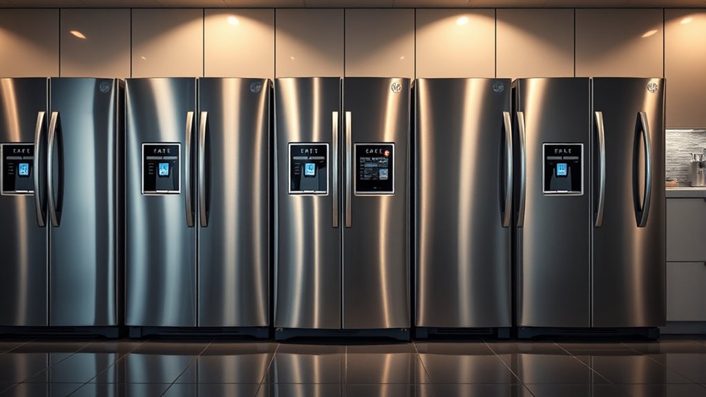 The 2025 GE refrigerator models introduce some truly clever features you won’t find elsewhere. For instance, their innovative “SmartFresh” technology subtly maintains ideal humidity levels, prolonging freshness without fuss. Additionally, the “TouchControl” interface seamlessly adapts to your habits, making adjustments effortless. These exclusive touches blend convenience with efficiency, ensuring your fridge stays ahead of the curve while adding a touch of modern elegance to your kitchen.