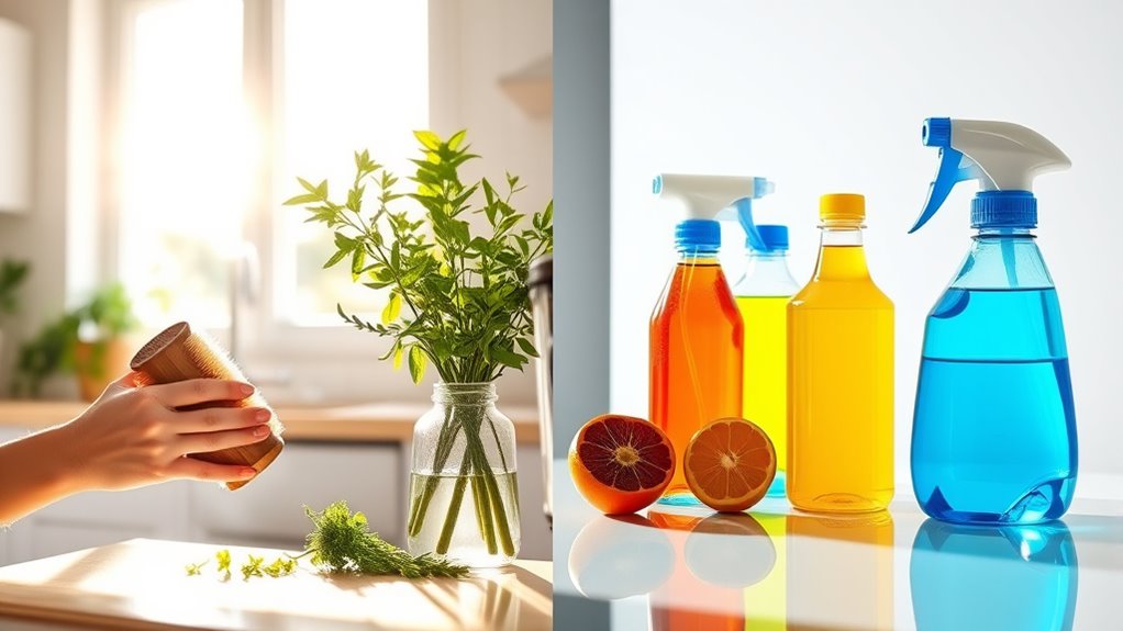 When choosing between green and chemical cleaning methods, I prefer green products like Simple Green All-Purpose Cleaner and SuperGreen for their eco-friendliness, safety, and versatility. They effectively clean surfaces without harsh chemicals, reducing risks for my family and the environment. Chemical cleaners may work faster for stubborn stains but often pose health and safety concerns. To discover which approach suits your needs best, explore the benefits and differences of each method more closely.