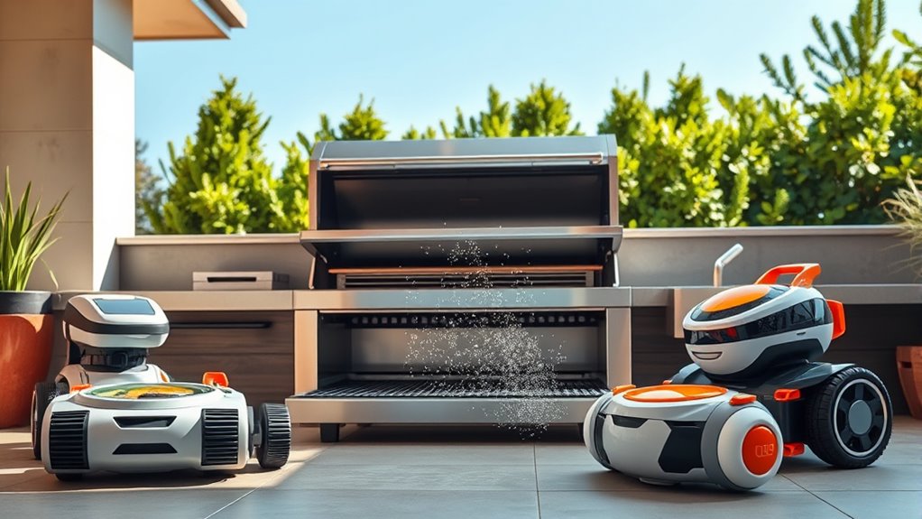 As a grill enthusiast, I’ve found that the best grill cleaning robots of 2025 make keeping your grill spotless a breeze. With features like powerful motors, automatic timers, and bristle-free designs, these devices effectively eliminate grease and grime. Compact and easy to use, they fit seamlessly into any outdoor cooking setup. Plus, many are rechargeable and feature durable, dishwasher-safe brushes for long-lasting performance. Stick around to discover my top picks and see which one fits your needs best!