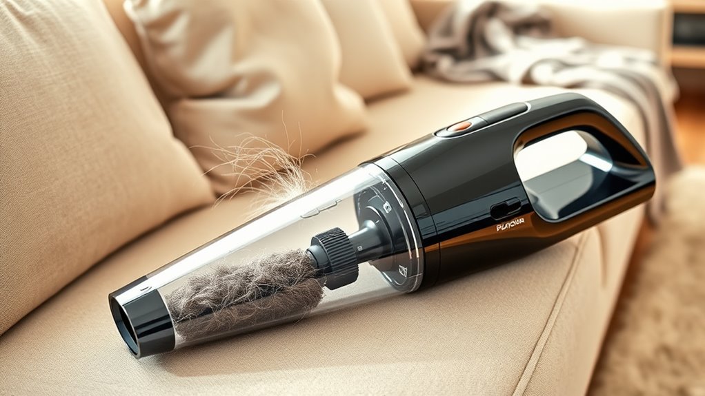 When selecting a handheld vacuum for pet hair, portability and weight are essential factors that can considerably impact your cleaning experience. A lightweight vacuum, typically under 3 pounds, is much easier to maneuver, reducing fatigue during longer cleaning sessions. Compact, portable designs make it simple to store in small spaces or car glove compartments, so you can quickly grab it for spot cleaning. An ergonomic handle enhances grip comfort, especially when cleaning in awkward positions or for extended periods. A cordless, slim-profile vacuum reaches easily into tight corners, under furniture, and into vehicle interiors without the hassle of cords. High portability means you can swiftly grab it to clean pet hair on furniture, stairs, or car seats whenever needed, making your cleaning routine more efficient and less tiring.