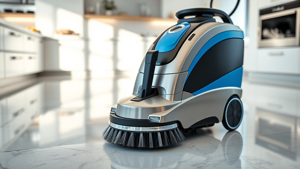Maintaining your hard floor cleaning machine involves regular attention to its key components to keep it running smoothly. I recommend routinely checking and cleaning filters, brushes, and water tanks to prevent clogs and guarantee peak performance. Following the manufacturer’s instructions for replacing pads, brushes, or filters—usually every few months or after a set number of uses—is essential. For machines that use steam, periodic descaling prevents mineral buildup and maintains consistent steam output. Always empty and rinse water and dirt containers after each use to avoid mold, bacteria, and odors. Additionally, schedule routine inspections of moving parts and electrical components. Proper maintenance not only prolongs your machine’s lifespan but also guarantees safe, effective cleaning every time.