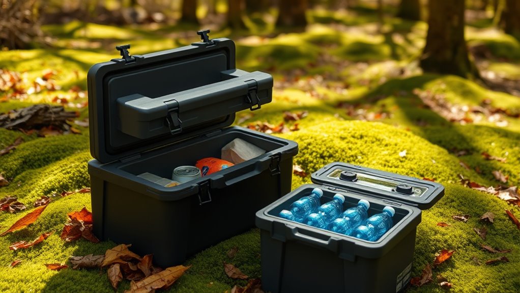 High-end camping coolers stand out primarily because of their advanced insulation materials, such as rotomolded foam or polyurethane, which are designed to maximize ice retention. These materials create a strong barrier against external heat, allowing the cooler to keep ice frozen for 4 to 7 days, even in temperatures over 90°F. The thickness and density of the insulation directly influence how well the cooler maintains low temperatures over time. Features like airtight seals, gasketed lids, and secure latches enhance insulation by preventing cold air from escaping. Real-world tests confirm that high-end coolers with superior insulation can sustain internal temperatures and keep ice longer, making them reliable companions for extended adventures. Proper insulation performance guarantees your food stays fresh and your drinks stay cold longer.