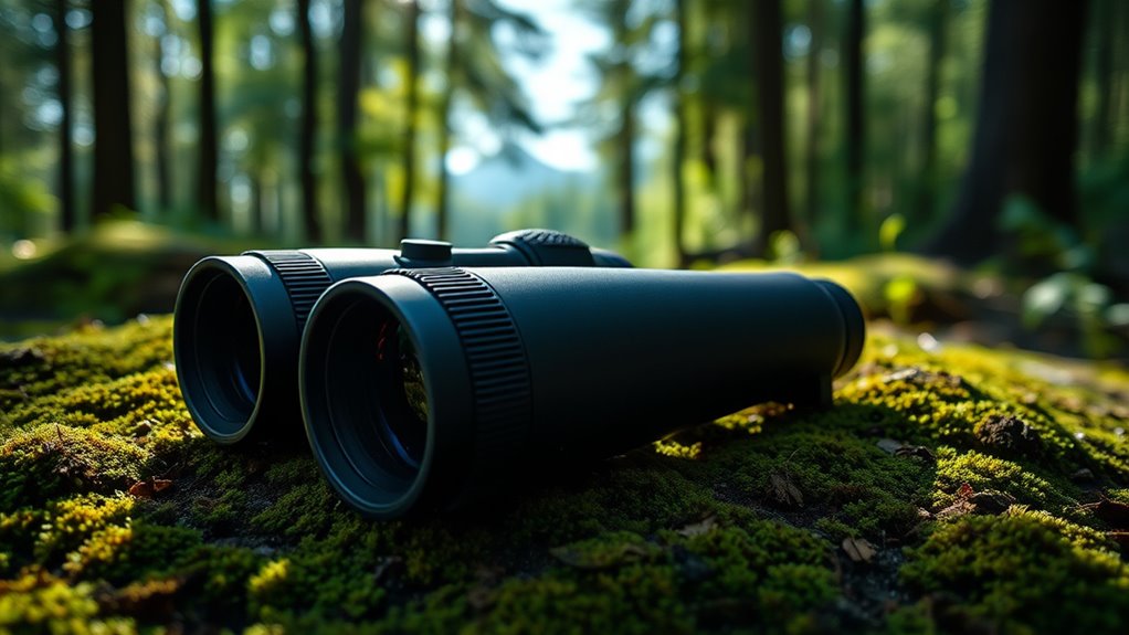 High-end hunting binoculars often feature advanced lens coatings that markedly enhance their optical performance. Fully multi-coated lenses boost light transmission and cut glare, resulting in brighter, clearer images even in challenging light. Dielectric coatings on prisms improve reflectivity and color accuracy, delivering vivid, true-to-life visuals across various conditions. Anti-reflective layers minimize light loss at air-to-glass surfaces, maximizing brightness and contrast. These coatings are also designed to resist scratches, oil, and dirt, ensuring consistent performance in rugged outdoor environments. The combination of multiple layers and specialized coatings greatly enhances image clarity, color fidelity, and low-light visibility. Choosing binoculars with superior lens coatings ensures you get the sharp, bright, and accurate images necessary for successful hunts.