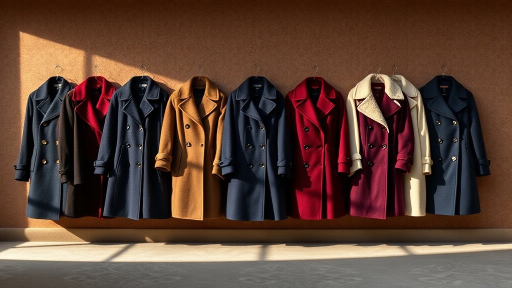 How do you choose the perfect high-end wool coat? Start by examining the fabric quality and composition. I always look for a blend of at least 85% wool for essential warmth and natural insulation. The feel of the fabric is vital; premium coats boast soft, dense blends that are lightweight yet warm. Pay attention to the weave—tightly woven fabrics resist pilling and wear, ensuring durability. A high-quality coat should have consistent texture, even coloration, and minimal pilling, which all signal careful craftsmanship. Don’t overlook the lining and fabric weight either, as they considerably enhance the coat’s comfort and longevity. By focusing on these factors, you’ll find a luxurious coat that truly elevates your winter wardrobe.