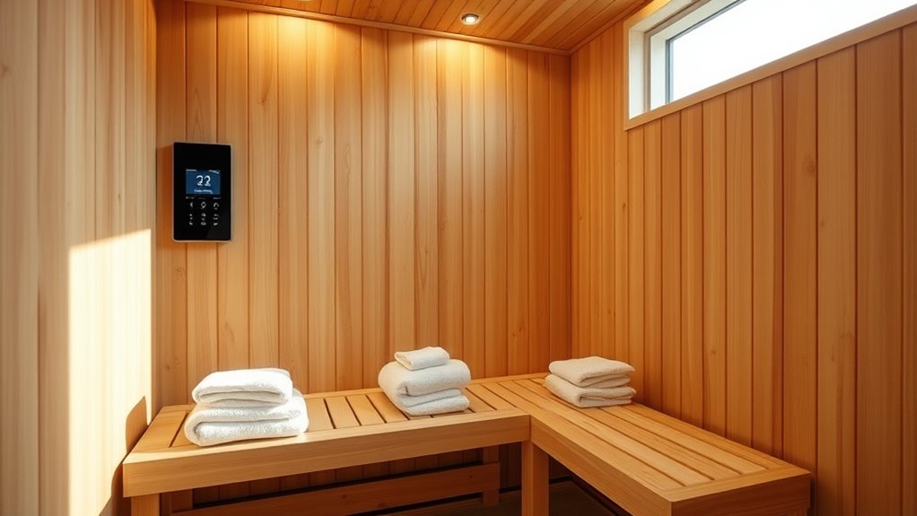 To keep my sauna kit functioning well, I regularly clean the interior with a gentle, non-abrasive cleaner and wipe down the benches and surfaces after each use. I also check the heater and controls monthly for any signs of wear or damage. It’s important to guarantee proper ventilation and replace the heater’s filters if applicable. Doing these simple maintenance steps helps my sauna stay safe, efficient, and enjoyable for years.