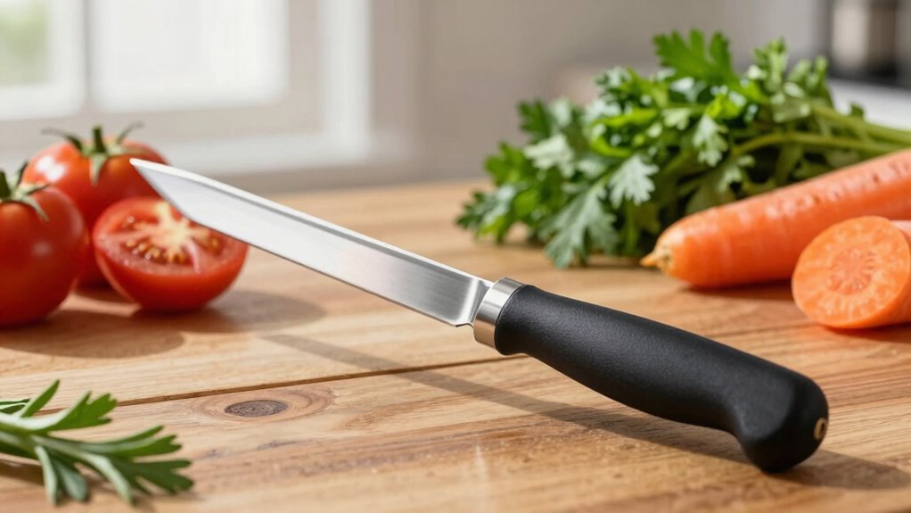 To keep my honing rod in top shape, I regularly clean it with warm, soapy water and a soft cloth, avoiding harsh abrasives. After drying it thoroughly, I store it in a dry place. I also make sure to wipe it down after each use to prevent residue buildup. Proper maintenance guarantees my rod stays effective and lasts longer, helping me keep my knives sharp effortlessly.