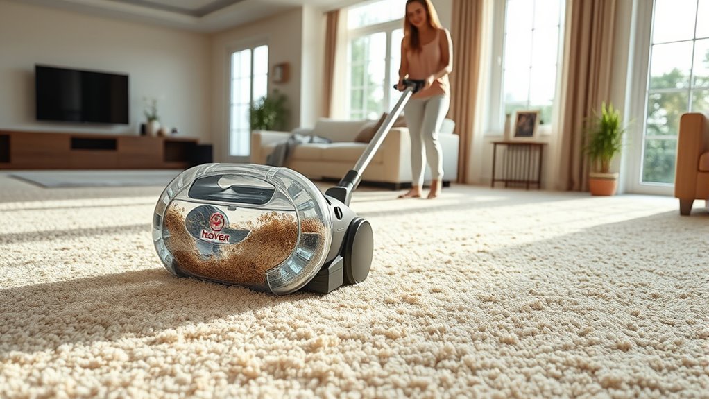 Choosing the right cleaning solution is key to getting the best results from your Hoover carpet cleaner. First, make sure the solution is compatible with your specific model to prevent damage and maximize cleaning efficiency. Check if the formula is designed for carpets, upholstery, or stairs, so you use the right product for each surface. It’s also important to review the ingredients, especially if you have children or pets, to avoid harmful chemicals. Additionally, determine whether the solution is concentrated or pre-mixed to know how much to use per cleaning session. Finally, stick to Hoover-recommended products to keep your warranty valid and guarantee peak performance. Using the proper, compatible solution helps you achieve the best deep-cleaning results while keeping your home safe.