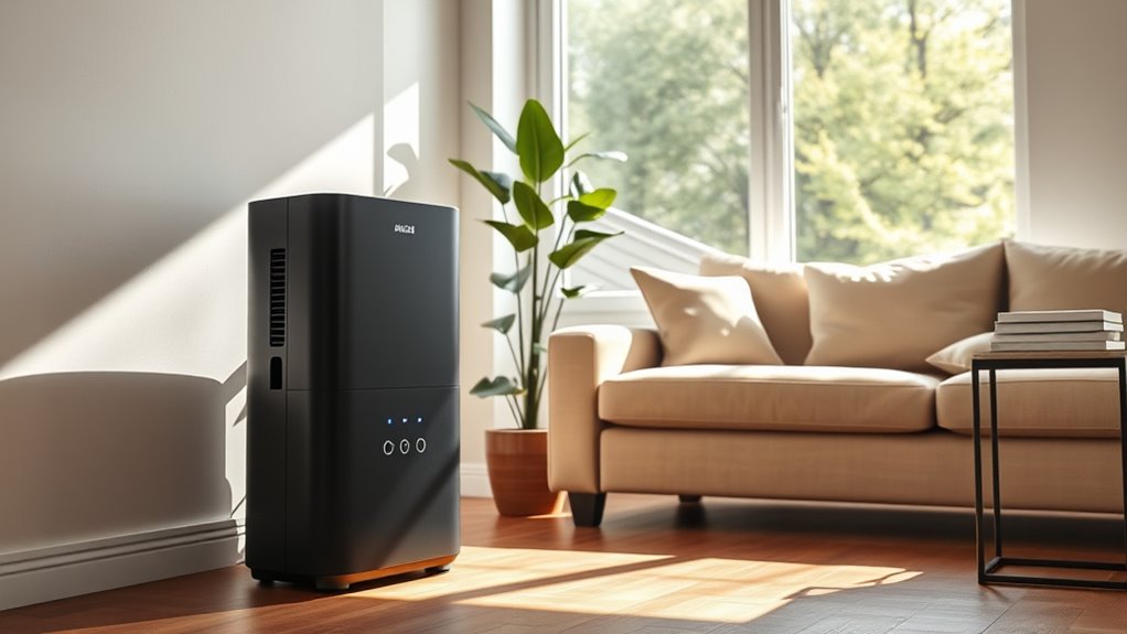 Filtration effectiveness is essential, but so is the noise level an air purifier produces, especially if you plan to use it in quiet spaces like bedrooms or offices. Noise levels are measured in decibels (dB), with lower dB indicating quieter operation. Many models feature sleep or night modes that run at 20-26 dB, ensuring minimal disturbance during rest. If you want near-silent operation, look for units below 25 dB, comparable to a whisper or rustling leaves. Adjustable fan speeds give you control over noise output, allowing a balance between filtration power and comfort. Always check the product specifications for noise ratings to find an air purifier that matches your preference for quietness, ensuring your environment remains peaceful without sacrificing air quality.