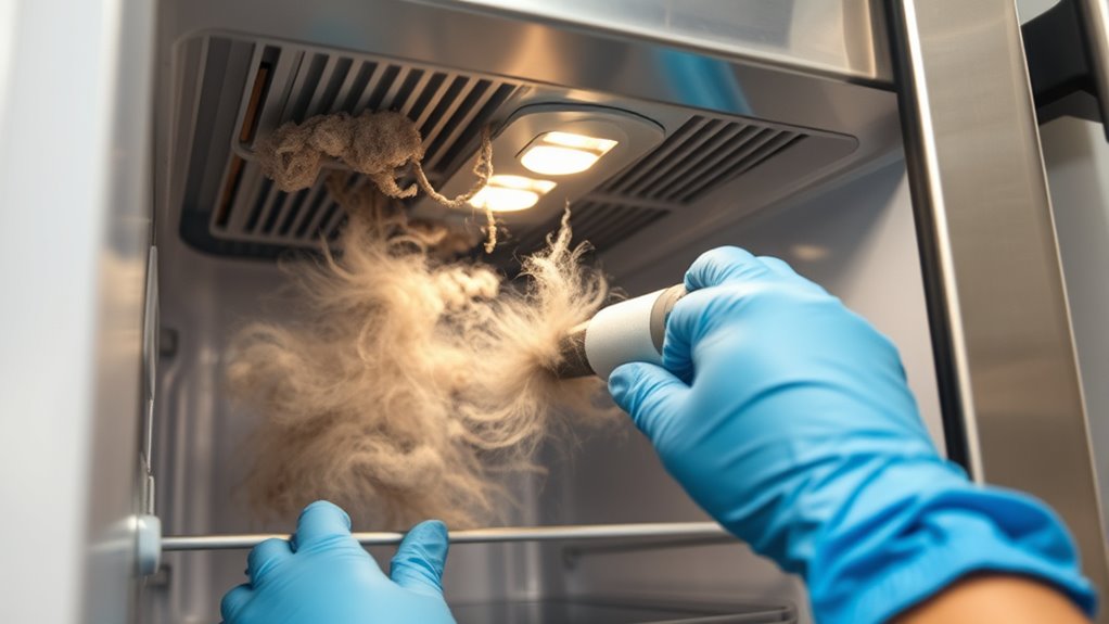 When cleaning refrigerator coils, safety should always come first. Always unplug the fridge before starting to avoid electrical shocks or injuries. Use the right tools, like a coil cleaning brush or vacuum with a brush attachment, to prevent damaging delicate parts. Wear protective gloves and eyewear to guard against dust, debris, and potential refrigerant leaks. Follow the manufacturer’s instructions carefully, especially when handling refrigerant lines and electrical connections. Ensure proper ventilation, especially if you’re using cleaning chemicals or sprays, to prevent inhaling fumes or creating fire hazards. Taking these precautions helps protect you from harm and guarantees the cleaning process is safe and effective. Prioritizing safety makes a significant difference in avoiding accidents or damage during coil cleaning.