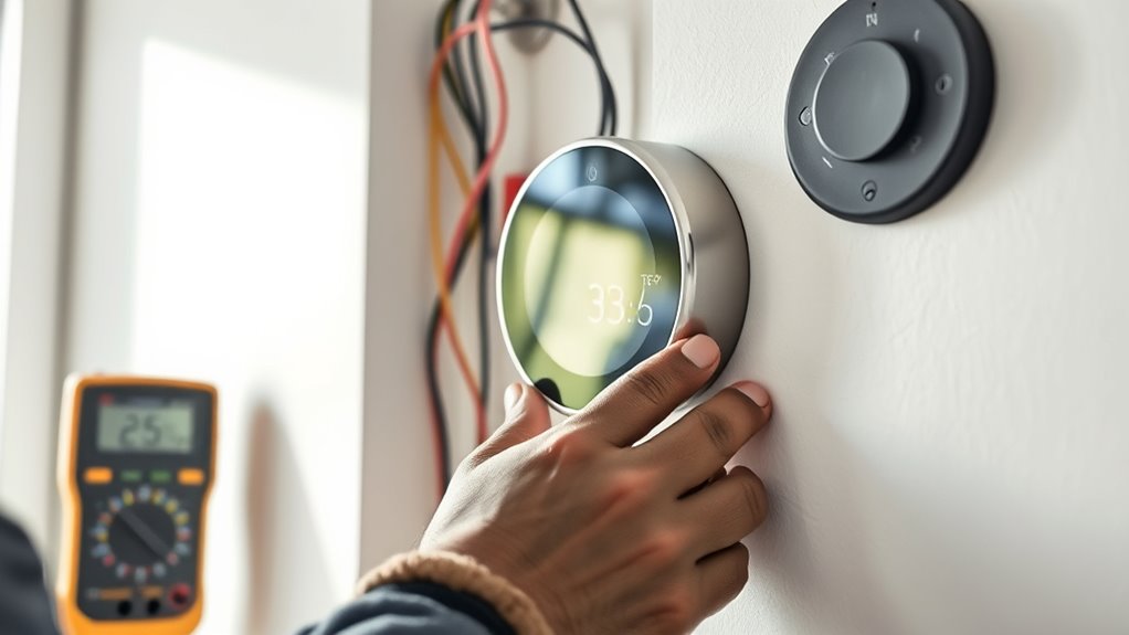 Making sure your HVAC system has the right wiring is crucial for a successful smart thermostat installation. Many systems require a C-wire to provide continuous power, which is essential for many smart models to operate reliably. If your system, like electric baseboard heaters, isn’t compatible or lacks a C-wire, you’ll need a specialized thermostat or a C-wire adapter. Before proceeding, verify your existing wiring supports necessary connections for heating, cooling, or multi-stage functions. Always check the manufacturer’s guidelines and perform a wiring compatibility test to avoid power issues later. If your system doesn’t support standard wiring, consider models designed for power-sharing or consult an HVAC professional. Proper power source compatibility ensures your smart thermostat functions smoothly and avoids potential installation headaches.