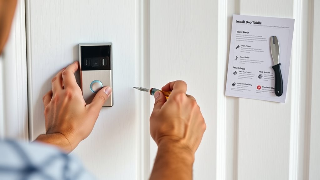 To successfully install your video doorbell, I recommend starting with a clear plan: choose the right mounting method, whether adhesive or screw-based, based on your surface type. Make certain the surface is clean and compatible, and follow steps for wiring or battery setup. Pay attention to security features like tamper-resistant mounts and proper placement for ideal coverage. If you want detailed tips and step-by-step guidance, there’s a lot more to discover that can make your installation easier.