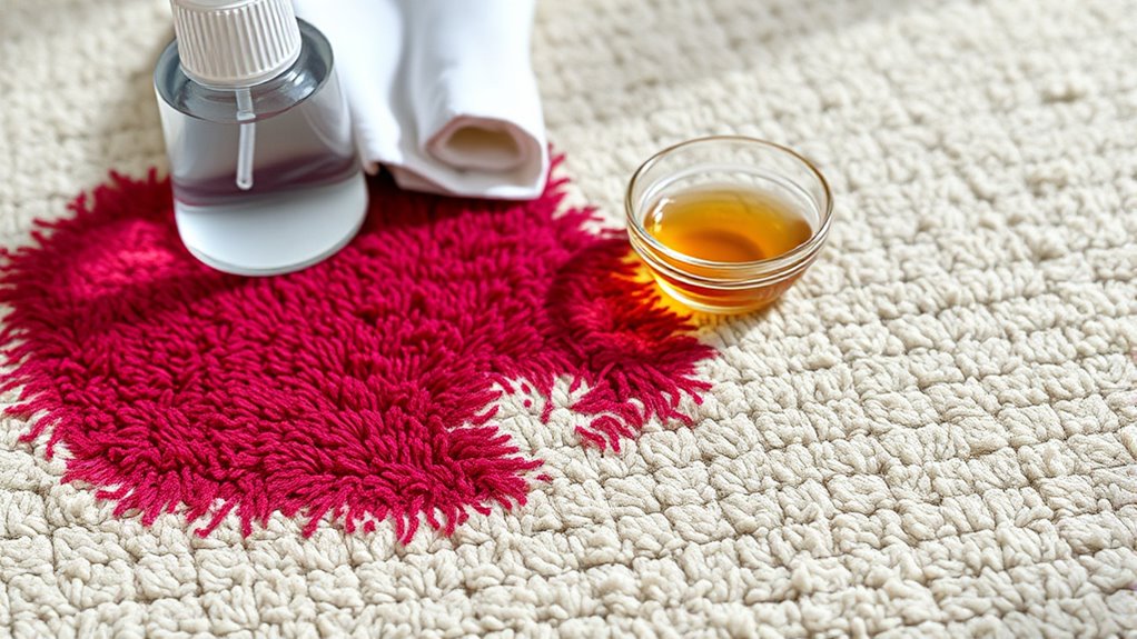 Ensuring the safety of your carpet and fabric is crucial when selecting a stain removal method, as using the wrong cleaning solution can cause lasting damage. Always verify that the cleaner is safe for your specific fiber—whether it’s wool, nylon, silk, or velvet. Stick to pH-neutral or manufacturer-recommended products to protect delicate or stain-resistant fibers. Before applying any solution, perform a patch test in an inconspicuous area to check for fading or damage. Be aware that some fibers, like silk or velvet, require specialized cleaning techniques and are best handled by professionals. Avoid harsh chemicals such as bleach or strong solvents on natural fibers or colorfast carpets, as these can weaken fibers and cause irreversible harm. Safety first ensures your carpet stays beautiful and intact.