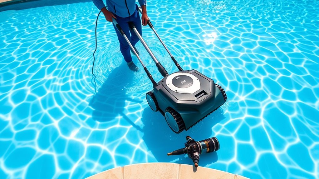 To get your pool sparkling, I recommend starting by removing any large debris with a wide-mouth vacuum head like the Poolmaster Big Sucker. Use a manual vacuum connected to a garden hose or try an automatic cleaner for quicker results. Always check your equipment’s compatibility, secure connections, and adjust your technique for water type and debris size. For more expert tips on achieving perfect pool cleanliness, keep exploring these useful strategies.