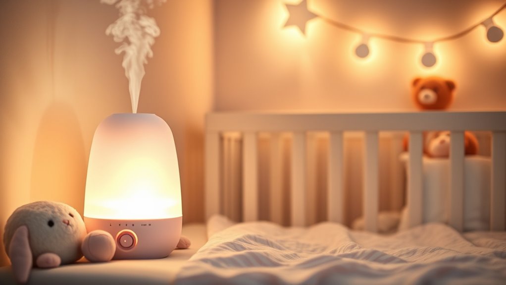 Think of the ideal humidity level like a gentle hug for your baby—between 40% and 50%. I’ve found that maintaining this range keeps the air moist enough to soothe coughs and congestion without becoming too damp. Using a hygrometer helps me keep a close eye on the humidity, ensuring my little one’s room stays cozy and comfortable, especially with the calming glow of a night light guiding the way.