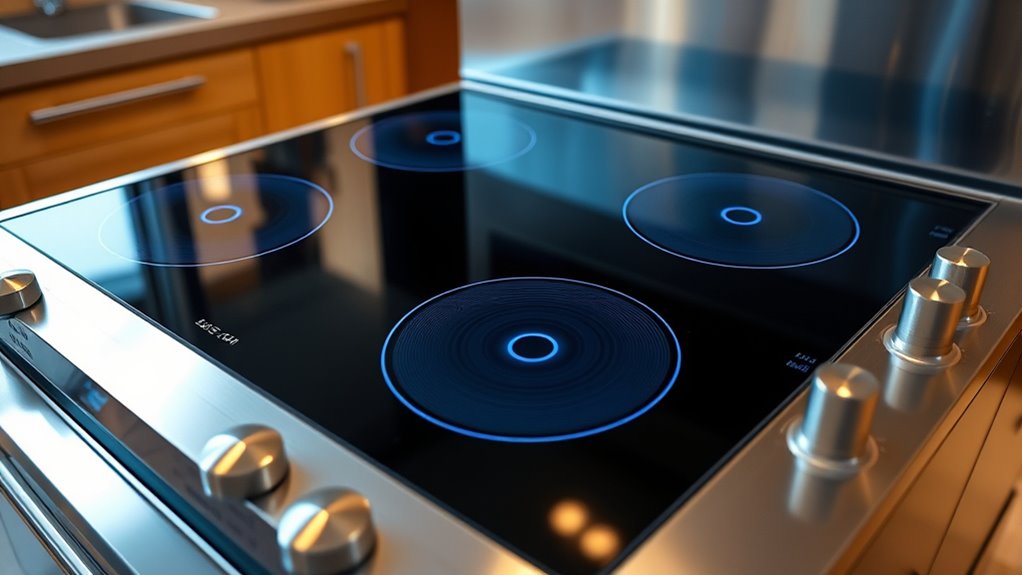 Ever wonder how to guarantee your induction range is safe to use? Checking for safety certifications like UL, ETL, or NSF is vital, as they ensure the appliance meets industry safety standards. Look for features such as over-heat protection, auto-shutdown, and hot surface indicators to prevent accidents during cooking. Auto-pan detection and circuit failure protection are essential for safeguarding against improper cookware placement and electrical issues. Make sure the range complies with regional safety standards, like CSA certification in North America. Additionally, consider ranges with child safety locks and clear warning indicators, especially if you have kids or inexperienced users at home. Prioritizing these safety features helps you cook confidently, knowing your induction range is designed with safety in mind.