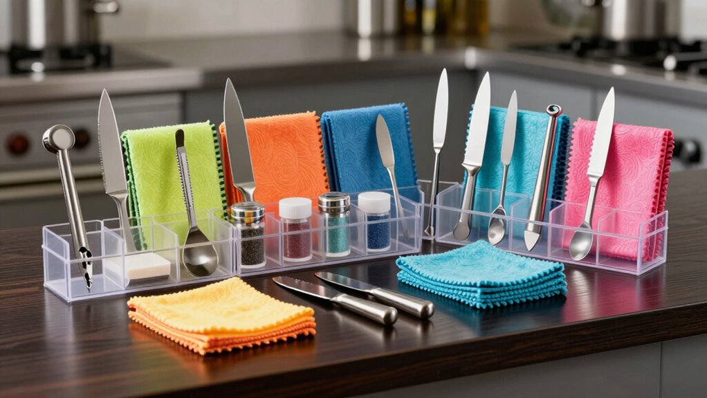 When selecting a knife cleaning kit, I look at how well it works with different blade types to guarantee compatibility. I also consider features that make the process easier, like user-friendly designs and protective lubricants. finally, I check for rust prevention, portability, and how conveniently I can store the kit to keep my knives in top shape.