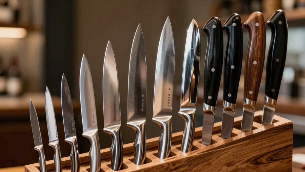 Ever wondered why some knives feel effortless to use while others cause hand fatigue? The answer lies in handle ergonomics and comfort. A well-designed handle reduces strain during extended use, thanks to contours that fit naturally in your hand. Handles with full tang construction offer better balance and control, essential for precision. Non-slip materials like pakkawood or rubber prevent slipping, even when your hands are wet, boosting safety. Handles that conform to natural hand contours minimize discomfort and reduce fatigue during repetitive tasks. Proper handle design not only enhances comfort but also improves safety by minimizing the risk of slipping or losing control. When choosing a professional knife set, prioritize ergonomic handles for a seamless, comfortable, and secure cutting experience.