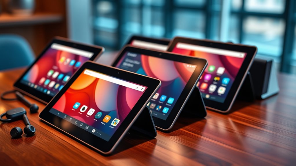 Imagine a race where battery life is the finish line—some 2025 Fire tablets sprint ahead while others take a more leisurely pace. I’ve found that the high-end models often boast up to 15-16 hours of use, perfect for all-day adventures. Meanwhile, mid-range options hover around 10-12 hours, still respectable. Overall, the battery specs across these models are quite competitive, making it easier to stay unplugged longer.