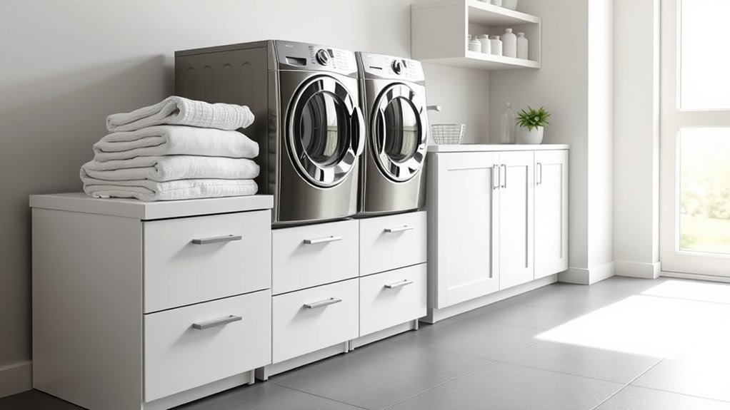 Laundry pedestals can improve energy efficiency by making it easier to load and unload your washer and dryer, which encourages better maintenance and less unnecessary use. When I use a pedestal, I find it easier to check for issues and guarantee my appliances run smoothly, saving energy in the long run. Plus, they often include storage, helping me stay organized and reduce clutter, indirectly boosting overall efficiency.