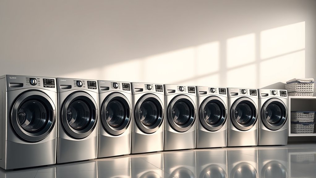 I’ve researched the top LG dryers for 2025 that combine energy efficiency and reliability. These models feature smart sensors, multiple cycle options, and eco-friendly technologies like Moisture Sensors and TurboSteam, ensuring gentle fabric care and minimal power use. They are durable, highly rated, and come with advanced connectivity for remote control and monitoring. Keep going to discover detailed details about each model and find the perfect dryer for your home needs.