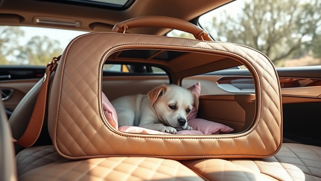 I find that high-quality materials like genuine leather, durable canvas, and soft yet sturdy nylon make luxury dog carriers both stylish and long-lasting. Leather adds elegance and ages beautifully, while canvas offers a classic look that’s resilient. Soft nylon provides comfort for your pet without sacrificing strength. When selecting a carrier, I look for these materials because they balance sophistication and durability, ensuring my pet’s comfort and my peace of mind during travels.