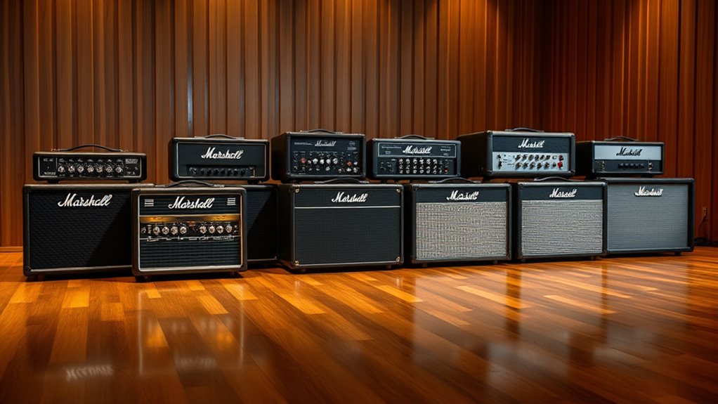 The build and durability of a luxury guitar amplifier combo are essential to guarantee it stands up to the demands of frequent use and transportation. These amps are crafted from high-quality materials like solid wood cabinets, reinforced joints, and sturdy metal chassis, ensuring they endure gigging and daily handling. Meticulous craftsmanship, often with hand-finished details, enhances both longevity and visual appeal. Heavy-duty components such as high-grade transformers, robust speaker cones, and reinforced wiring guarantee consistent performance over time. Practical durability features like protective corner guards, sturdy handles, and vibration-resistant mounts help prevent damage during movement. Additionally, well-designed chassis with heat dissipation elements and protective grills safeguard internal components, extending the amplifier’s lifespan and maintaining ideal performance.