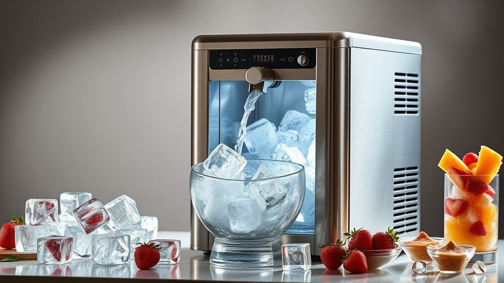 I’ve found that maintaining my premium ice machine isn’t complicated, but it’s essential for top performance. I regularly clean the condenser coils, change filters as recommended, and descale the machine to prevent mineral buildup. Plus, I check for any leaks or unusual noises. Doing these simple tasks keeps my machine running smoothly and guarantees I always get perfect, high-quality ice for my creations.