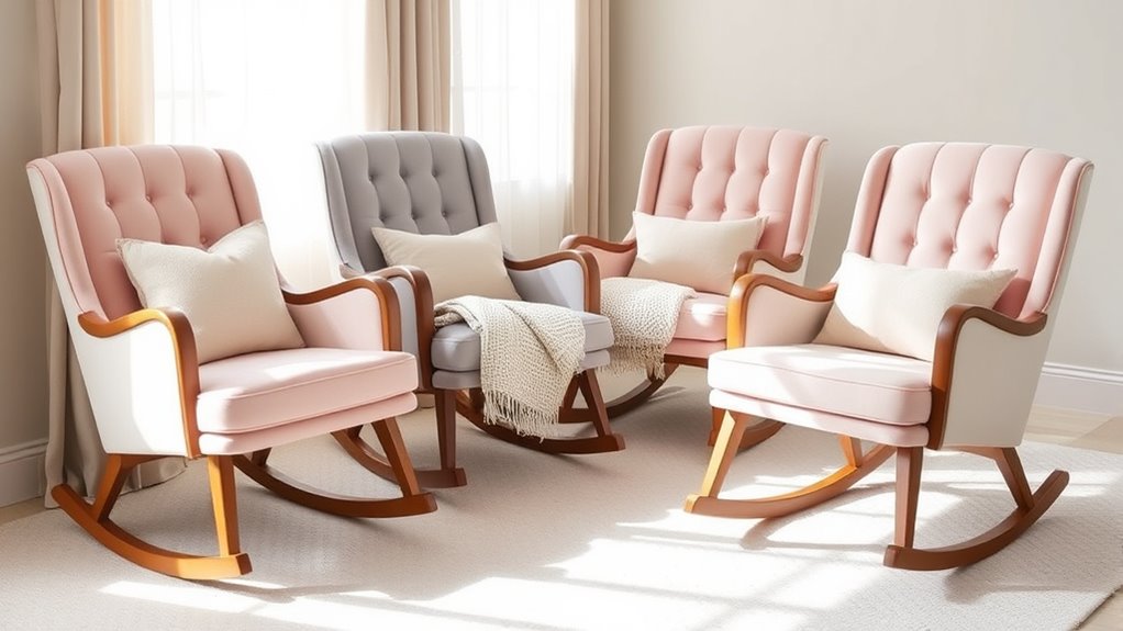 The style and aesthetic appeal of a nursery rocking chair play a crucial role in creating a harmonious and inviting space. I look for chairs that complement the overall decor theme, whether modern, traditional, or minimalist, to guarantee a cohesive look. Upholstery choices like plush fabrics or leather not only add visual interest but also help the chair blend seamlessly with other nursery furnishings. I consider the color palette, favoring neutral tones or pastels that promote a calming environment. Design details such as tufting, piping, or decorative wood accents can add character and elevate the room’s aesthetic. Finally, I pay attention to the chair’s shape and silhouette, ensuring it harmonizes with the room’s architectural elements and furniture style for a unified and stylish nursery.