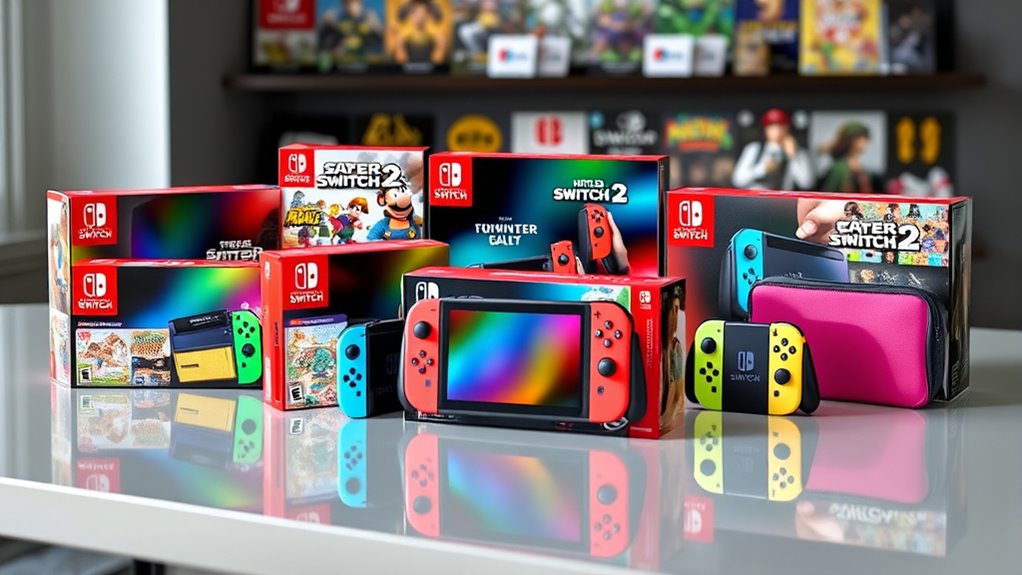 After considering the bundle contents and accessories, the next step is evaluating the gaming experience and compatibility of the Nintendo Switch 2 bundles available. First, I make sure the bundle includes compatible controllers and accessories designed specifically for the Nintendo Switch 2 to optimize gameplay. I also check if it supports various play modes—TV, tabletop, and handheld—to fit my gaming style. Features like high-resolution touchscreens and motion controls are essential for an immersive experience. Plus, I confirm compatibility with online multiplayer services and game libraries to access a wide range of games. Finally, I look for bundles that offer protection and enhancement accessories, ensuring my device maintains its performance while improving gameplay control.