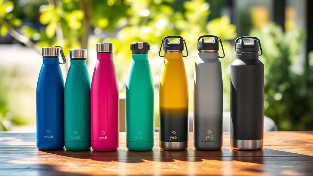 Design and usability play crucial roles in selecting the right water bottle, and understanding the differences between Owala and Yeti can make all the difference. I always consider how easy it is to use the bottle. For instance, Owala’s one-handed flip-top lid is a game changer for quick sips, while Yeti offers robust push-button options. I also appreciate drinking versatility; Owala often includes built-in straws alongside wide-mouth spouts. Portability matters too—ergonomic handles and carry loops make a bottle easier to take on the go. Plus, I check for leak-proof lids and locking mechanisms to avoid spills. Finally, I make sure the bottle’s shape and size fit comfortably in my hand and bag, enhancing overall usability.