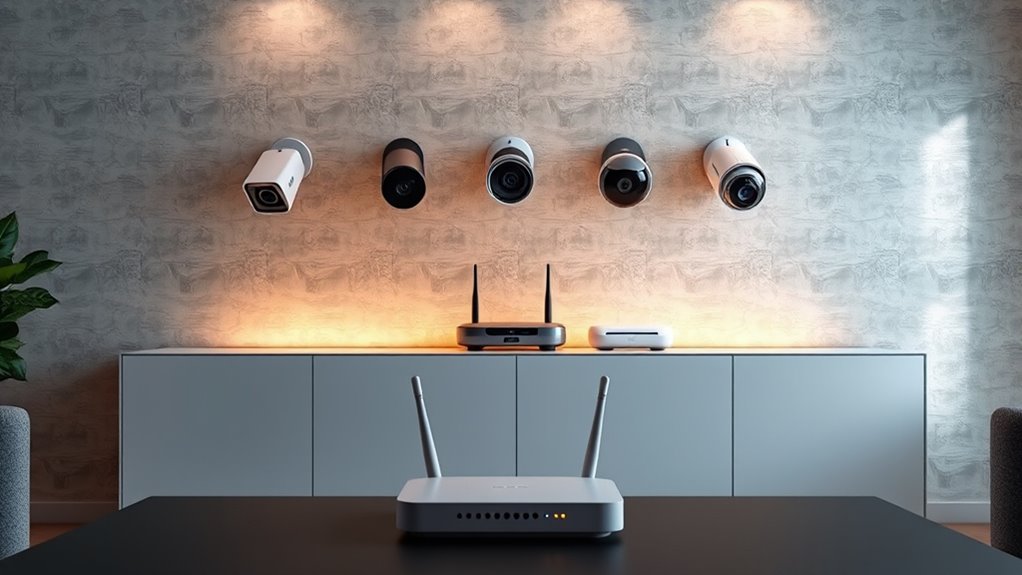 If you’re choosing between PoE and Wi-Fi security cameras in 2025, I recommend considering your installation needs and environment. PoE cameras offer stable power and connection, ideal for permanent setups and high-res footage, but require wiring. Wi-Fi cameras are easier to install and flexible but can be affected by signal issues. Exploring the top options shows how each type fits different security needs—keep going to find out which one’s best for you.