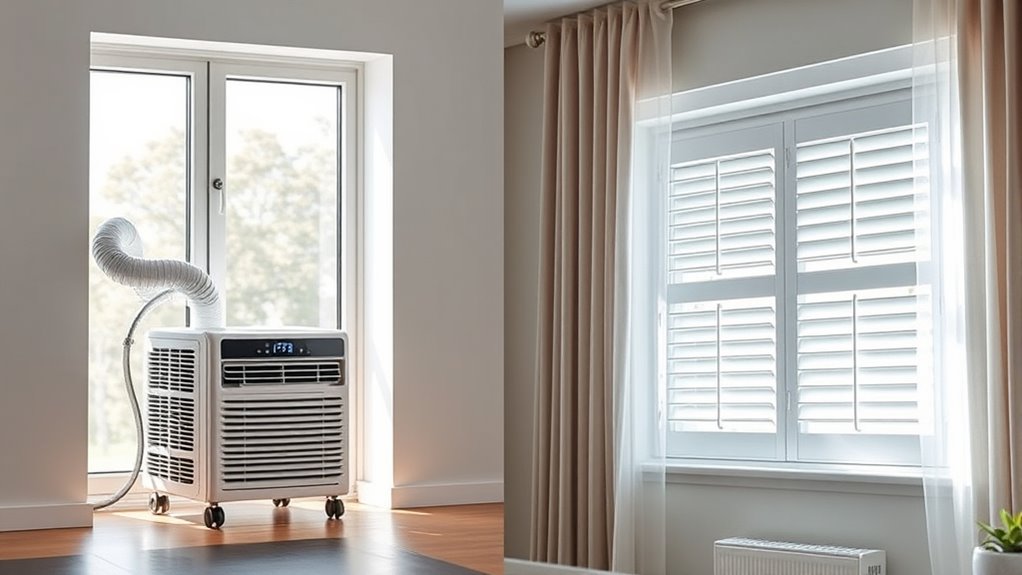 If you’re choosing between portable and window air conditioners, I’d consider your space size, mobility needs, and installation preferences. Portable units are great if you want flexibility—they’re easy to move and ideal for small to medium rooms. Window units often deliver higher cooling power for fixed setups, especially in larger spaces. To pick the best for your situation, it helps to compare capacity, efficiency, and setup details—so keep exploring for the perfect fit.