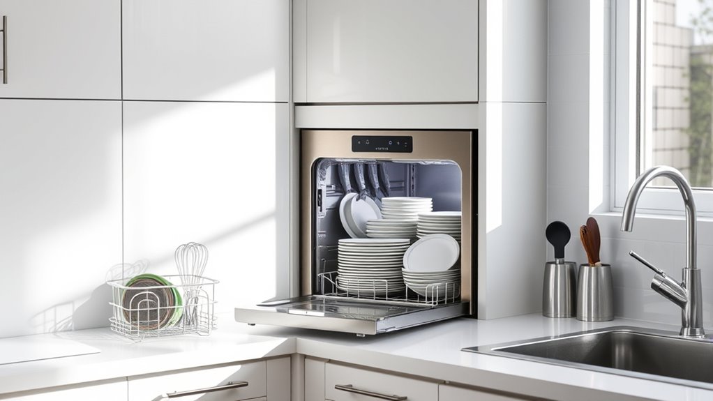 If you’re tired of spending ages hand-washing dishes, a portable dishwasher is truly a game-changer—like having a secret dishwasher ninja in your kitchen! Whether you choose a compact model or one with smart features, you’ll save so much time and space that your kitchen will feel twice as big. Trust me, once you go portable, you’ll wonder how you ever lived without it. Say goodbye to dirty dishes and hello to effortless cleaning!