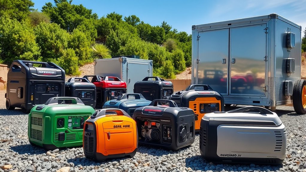 When choosing between portable and standby generators, I consider my power needs, mobility, and budget. Portable units are great for camping, outdoor activities, or emergency backup, offering flexibility and easy transport. Standby generators are ideal for whole-home backup or larger jobs, providing continuous power without fuss. Each has pros and cons depending on usage, size, and fuel options. To make the best choice, explore the key differences further—they’ll help you find the perfect solution.
