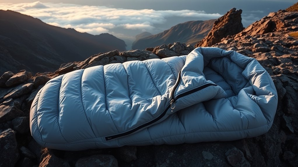 Choosing the right insulation type is essential for getting the best performance from a premium backpacking sleeping bag. I consider whether I need synthetic or down insulation based on my outdoor plans. Down, like 650 or 600 fill power, offers superior loft and warmth-to-weight ratio, making it ideal for dry, cold conditions. High-quality down retains heat efficiently and compresses easily for packing. Synthetic insulation, such as Cirroloft, is more affordable, easier to care for, and maintains insulation even when damp, perfect for wet environments. Durability also matters; well-stitched down bags keep loft longer, while synthetic bags resist clumping over time. Ultimately, my choice depends on climate and conditions—down for dry, cold nights, synthetic for damp or variable weather.