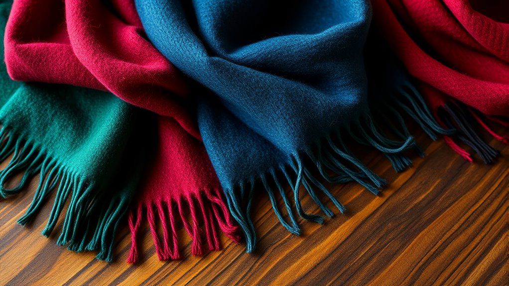 If you’re looking for durable cashmere scarves for everyday wear, I recommend choosing those with tight weaves and high-quality fibers. I personally opt for scarves from reputable brands known for their craftsmanship, like Loro Piana or Brunello Cucinelli. I also prefer scarves with reinforced edges or double-layer construction, which resist pilling and maintain their softness over time. These choices keep my scarves looking great, no matter how often I wear them.