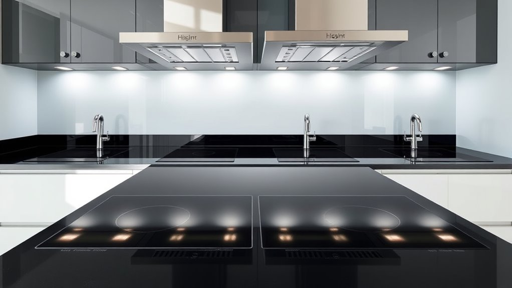 The durability of materials in premium induction cooktops with integrated ventilation is essential for guaranteeing long-lasting performance and maintaining their sleek appearance. High-quality surfaces like tempered glass or ceramic resist scratches, cracks, and heat damage, keeping the cooktop looking new over time. Stainless steel or reinforced metal frames provide strength and stability, especially in busy kitchens or commercial settings. The longevity of the ventilation components depends on corrosion-resistant materials and efficient heat dissipation, which help them withstand frequent use and cleaning. Choosing materials that meet safety standards, like UL or NSF certifications, ensures reliability and safety. Proper material selection not only preserves the cooktop’s aesthetic appeal but also guarantees consistent performance through years of regular use.