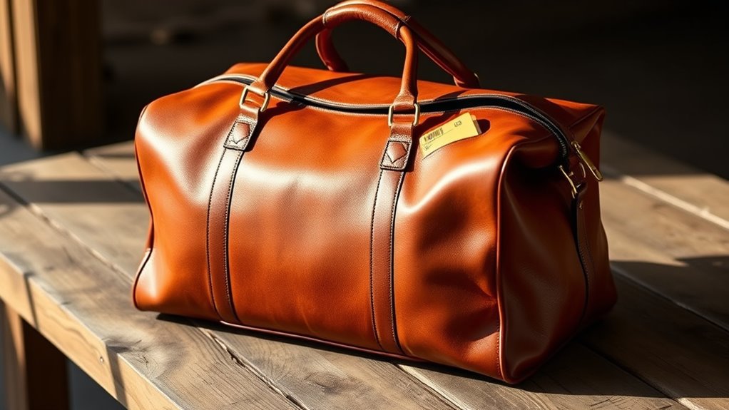 Choosing the right leather quality and texture is essential for making certain your duffle bag withstands weekend trips while looking stylish. High-quality leather, like full-grain or top-grain, offers superior durability and a luxurious feel that ages beautifully. The texture varies from smooth and supple to rugged and distressed, depending on the tanning and finishing process, giving you options to match your style. Full-grain leather develops a unique patina over time, adding character and enhancing its aesthetic appeal. Natural grain patterns and surface imperfections are indicators of authentic leather, making each bag unique. Selecting the right type and finish guarantees your bag resists scratches, wear, and environmental damage, ultimately prolonging its lifespan and maintaining its handsome appearance for years to come.