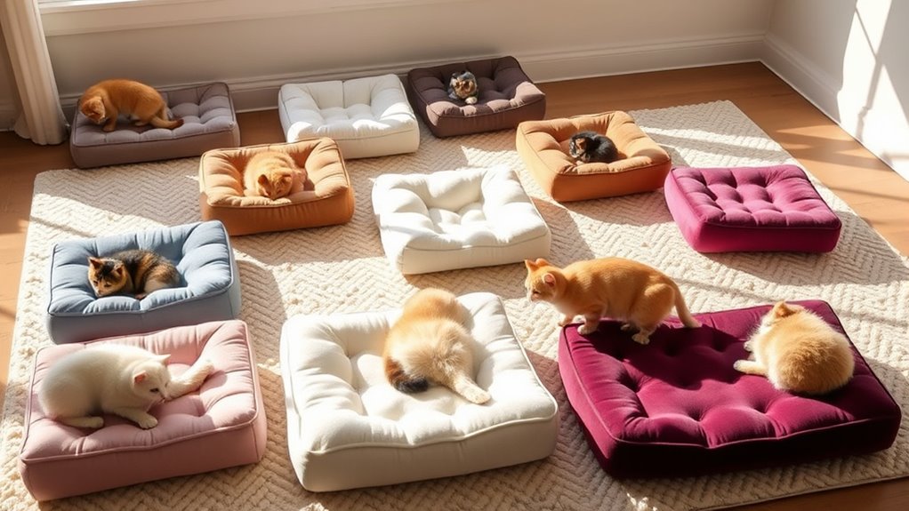Did you know that around 70% of cats will experience joint issues as they age? I’ve found that the best materials for orthopedic cat beds are memory foam and high-density foam. These materials provide excellent support and contour to your cat’s body, helping to alleviate pressure on joints. Additionally, look for beds with removable, washable covers made from breathable fabrics to guarantee comfort and hygiene. Your feline will love it!