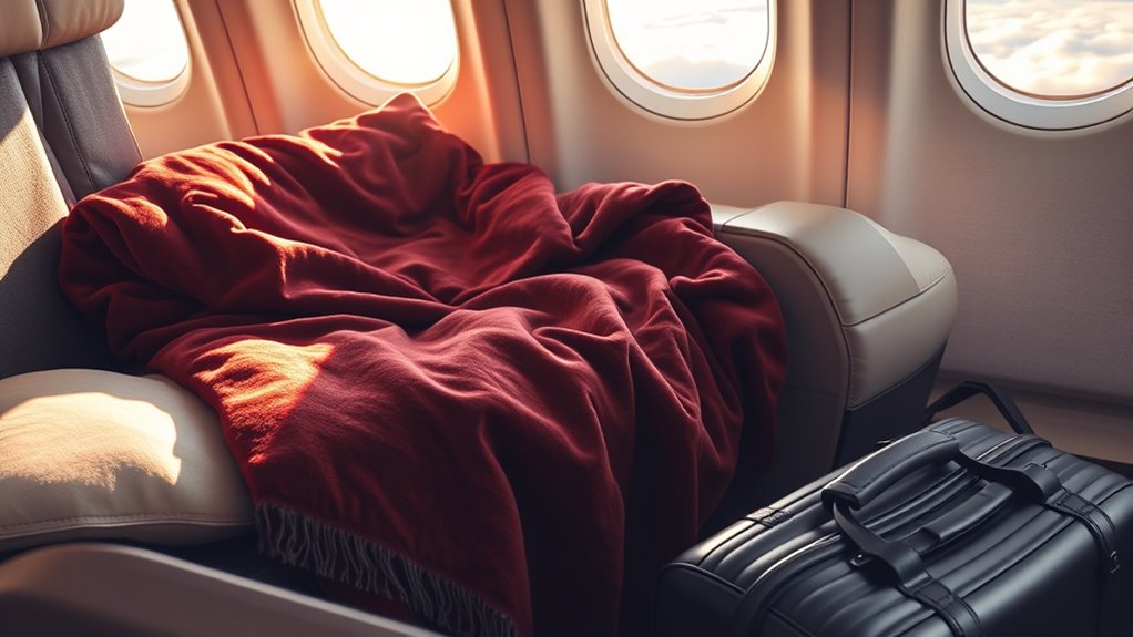 Choosing the right size and coverage for a travel blanket can make a huge difference in your comfort during long flights. I recommend looking for blankets that measure around 60-70 inches in length, ensuring they cover your legs, torso, and shoulders adequately. This extra coverage is vital, especially when you’re trying to stay warm in a chilly cabin. It’s also important to contemplate how the blanket accommodates different seating positions—whether you’re reclining or sitting upright, you don’t want any gaps. Versatile sizes are a bonus, as they can double as a pillow or fold compactly for easy storage. Just remember, larger blankets can be heavier, so find a balance between coverage and portability.